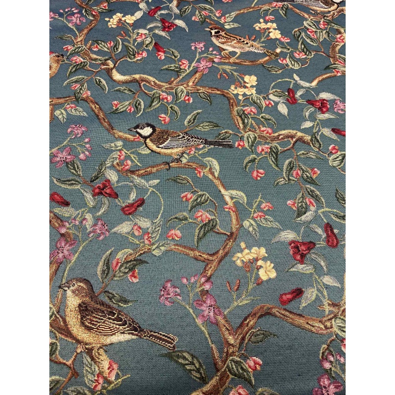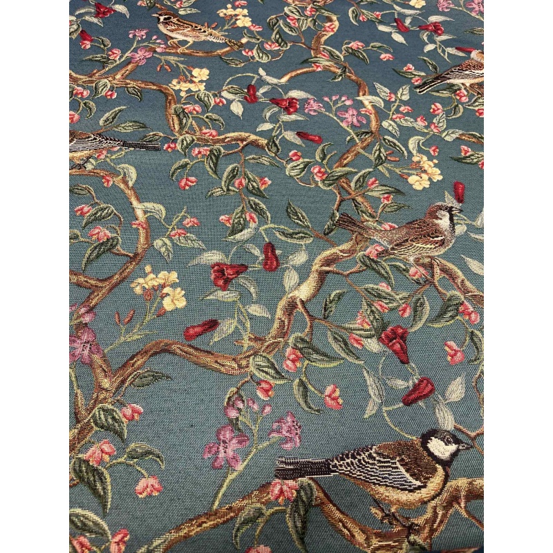Gobeläänkangas, sinakal taustal linnud oksal.