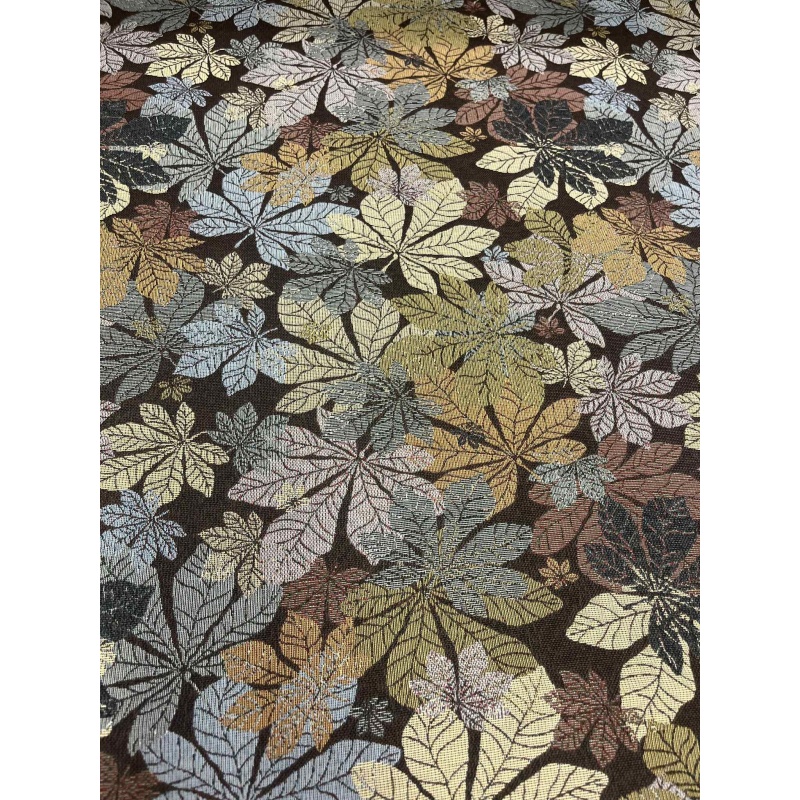 Mööblikangas Gobelään Tumepruunil rohekad lehed.