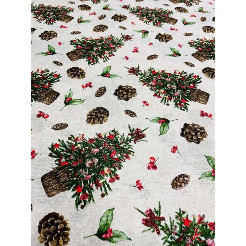 Prinditud dekoratiivkangas, beežil põhjal kuused.