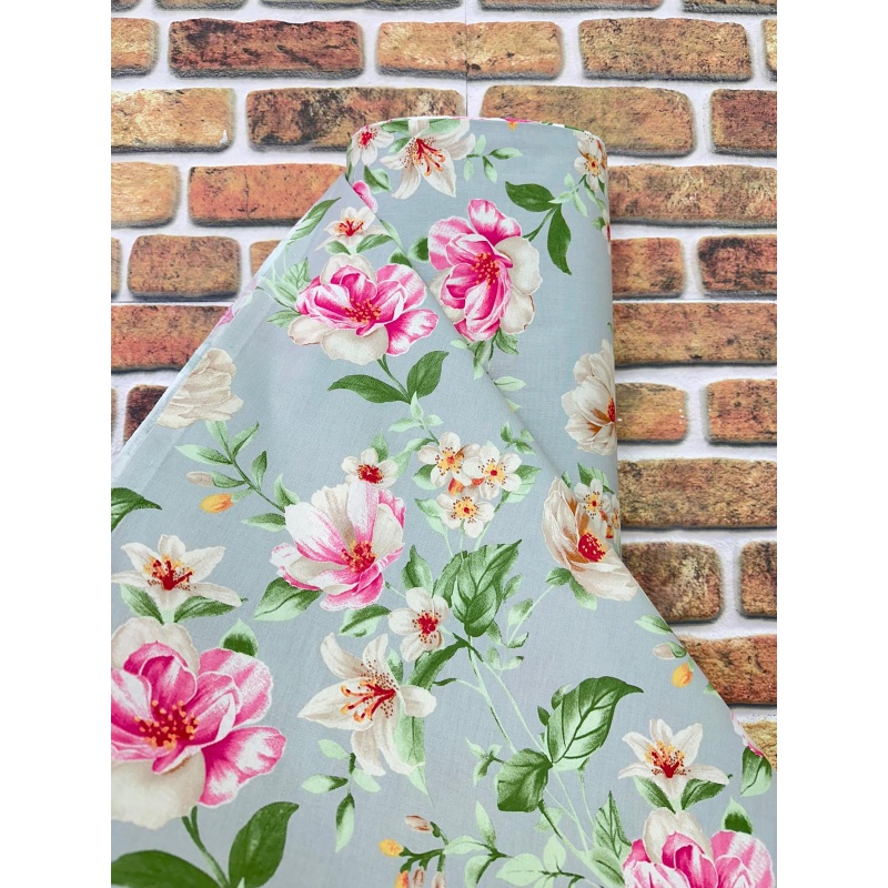 Puuvillane kangas 2,4m hele münditooni põhi ja roosad anemoonid.