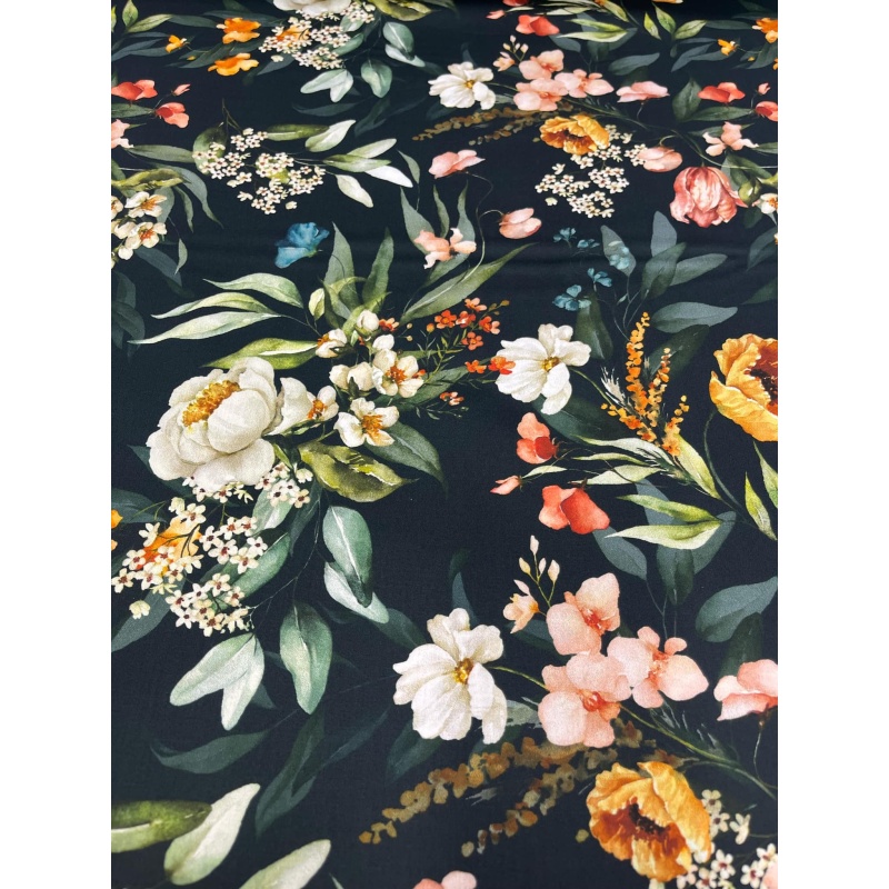 Puuvillasatiin prinditud 2,4m mustal lillekimbud.